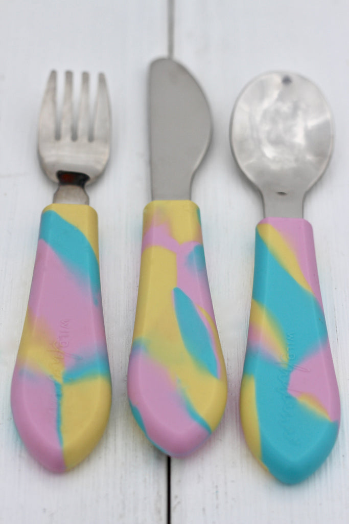 Our custom-designed cutlery has a soft silicone handle with a stainless steel component, perfect for your babe as they learn to master cutting and self-feeding!